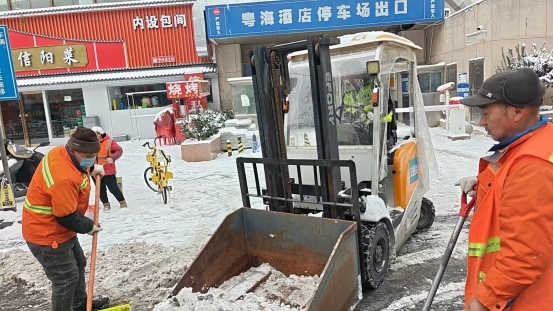 在街道的统筹号召下,辖区公共单位迅速响应、各展所长:党员干部组成“先锋突击队”,扛起铁锹奔赴背街小巷;沿街商户积极落实“门前三包”责任,自发组建“商户互助组”,接力清扫门前人行道及相邻路段;物业公司组织员工重点清理小区出入口、单元楼道口及地下车库通道;社区工作者与网格员全员下沉,带领居民志愿者分片包干、逐路推进。寒风中,城管队员的藏青蓝、志愿者的志愿红、环卫工人的橙黄服交织成冬日里最动人的风景线,近300名作业人员手手相传、默契配合,铲雪、扫雪、堆雪一气呵成,用人力筑起畅通防线。